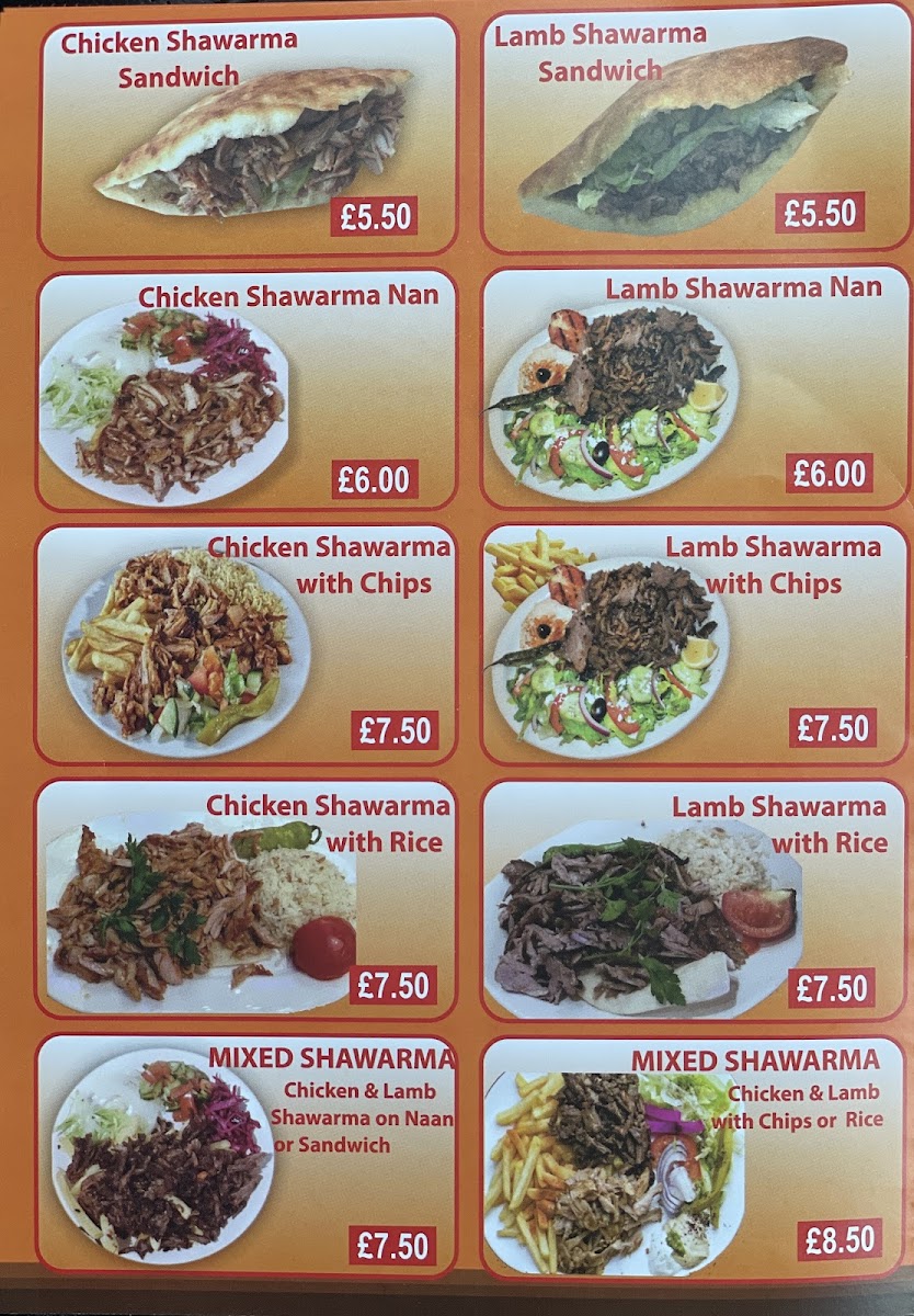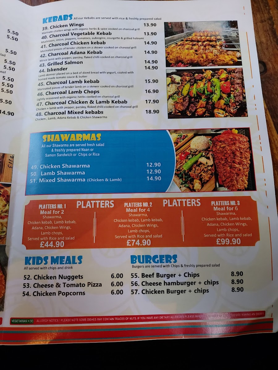 Popular choices like the Charcoal Mixed Kebab, Chicken and Lamb Shawarma with Chips and Salad, or a Mixed Mezze Platter fit well with leisurely meals shared among friends or family. The platters for two or four make it easy to experience a range of flavors in one sitting, encouraging a communal dining experience.